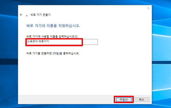 ④ 바로가기 만들기 → 바로 가기 사용할 이름 입력 "스포조이 바로가기" 입력 → 마침