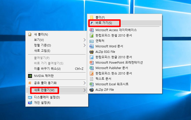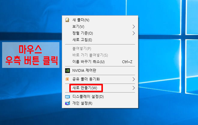 ① 바탕화면에서 마우스 우측 버튼을 클릭합니다. → 우측 클릭 → 새로 만들기 클릭