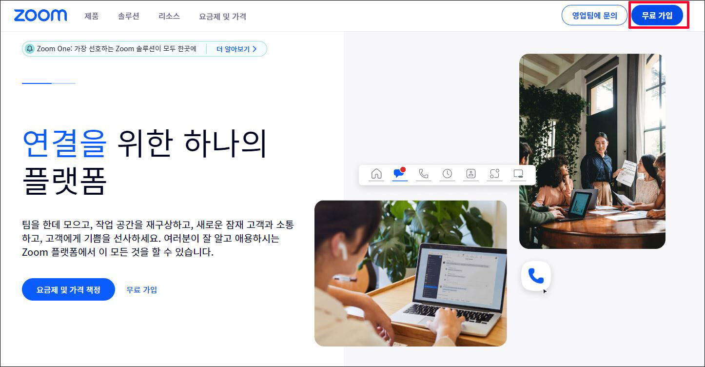 ② 줌 홈페이지에 이동 → 우측 상단 <무료가입>을 클릭합니다.