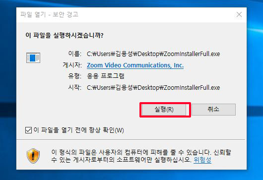 ④ "이 파일을 실행하시겠습니까?" → 실행 → 줌 설치 시작