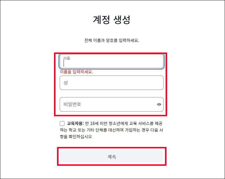⑥ 계정 생성 → 이름 → 성 → 비밀번호 입력 → 계속