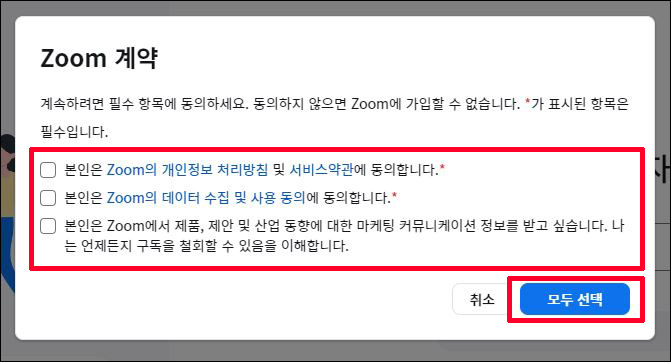 ③ zoom 계약 페이지 → 모두 선택 클릭