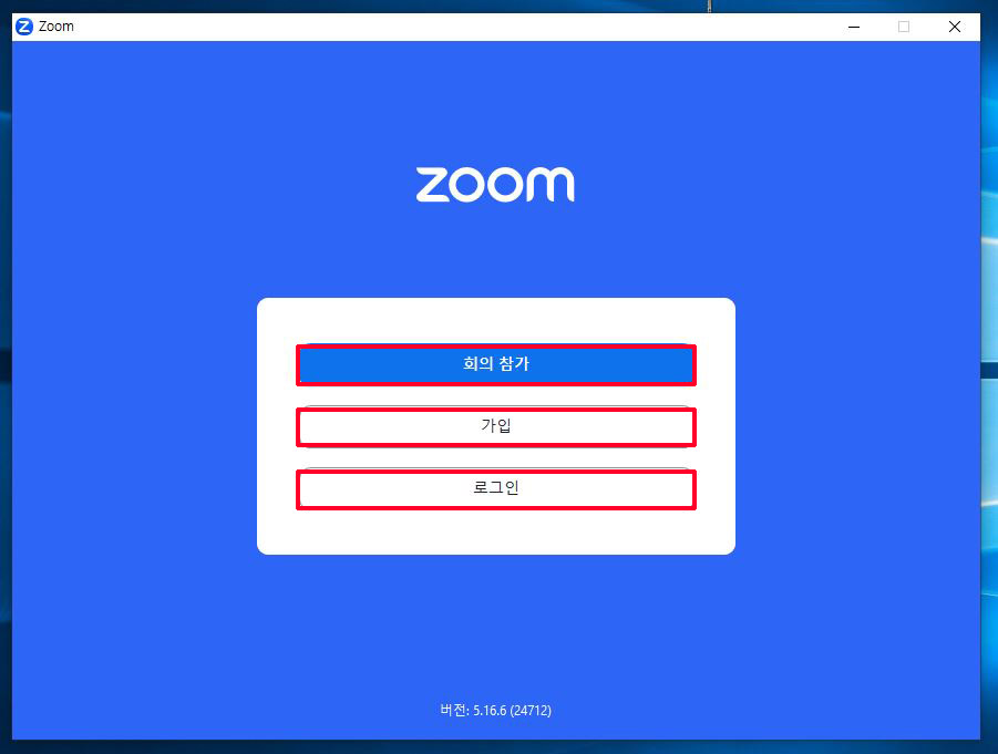 ⑤ 줌 실행 화면 → 회의참가, 가입, 로그인을 선택해 줌(zoom)을 실행할 수 있다.