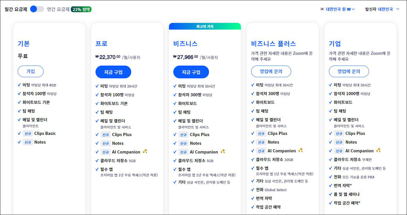 줌은 한계가 있는 무료계정을 사용하실 수 있으나 요금제를 통해 더 많은 기능으로 다양한 서비스를 제공받을 수 있다.