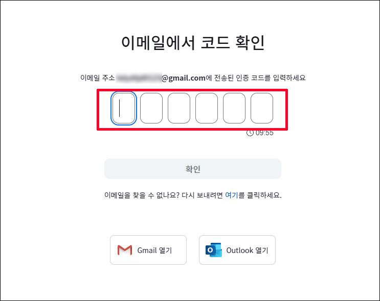 ⑤ 기입한 이메일에서 코드 확인(6자리 숫자) → 상단에 기입 후 확인