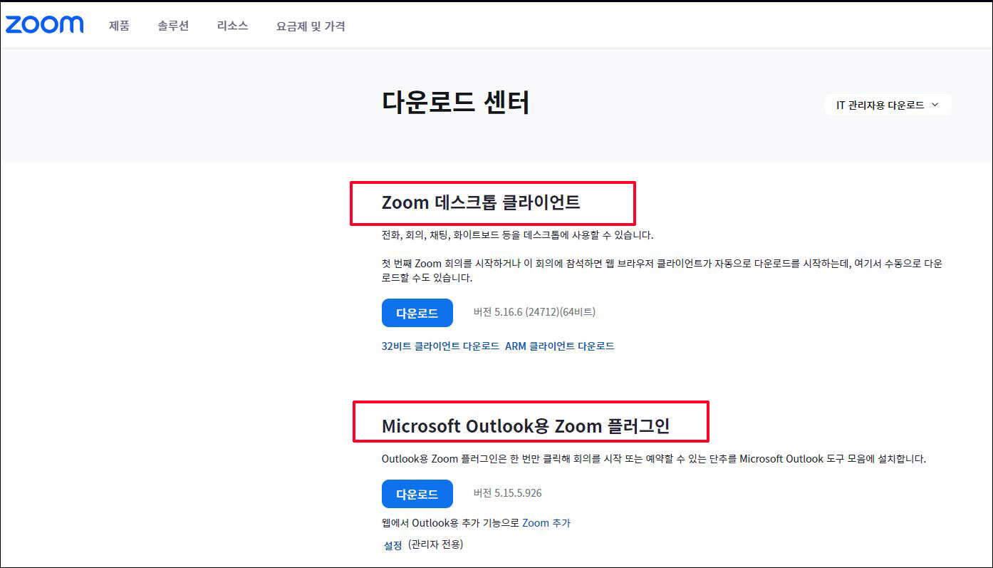 ※ pc용은 맨 상단의 Zoom 데스크톱 클라이언트 다운로드