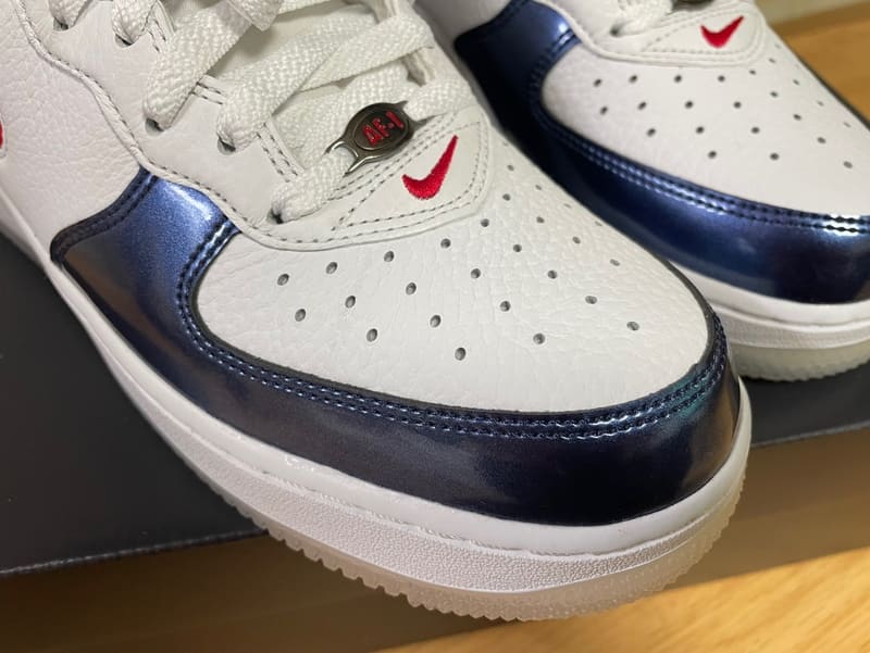 슈레이스에 끼워져 있는 듀브레가 인상적입니다. AF-1이 음각으로 새겨져 있습니다. 옛 향수를 불러일으킵니다. 듀브레 아래는 레드 컬러의 작은 나이키 스우시가 자리 잡고 있습니다. 그리고 그 당시 엄청난 인기를 끌었던 나이키 뽈록이 나이키 스우시가 자리 잡고 있고 바디의 가죽은 그 당시의 제품과 비슷한 느낌이 많이 듭니다.