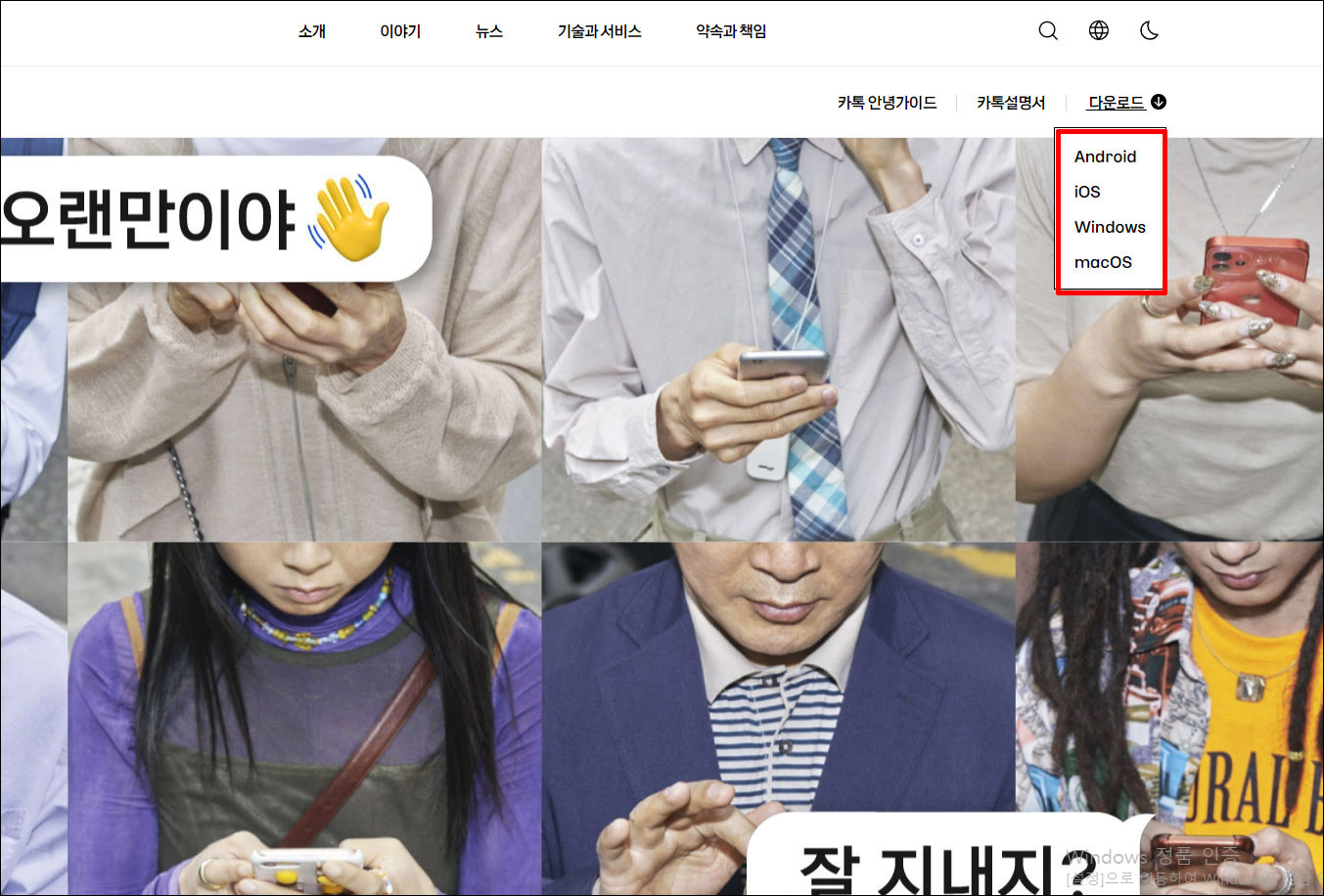 ② 다운로드 클릭 → WINDOWS 클릭 (PC에 카톡을 설치해야 하기 때문에 "윈도우"를 선택합니다)