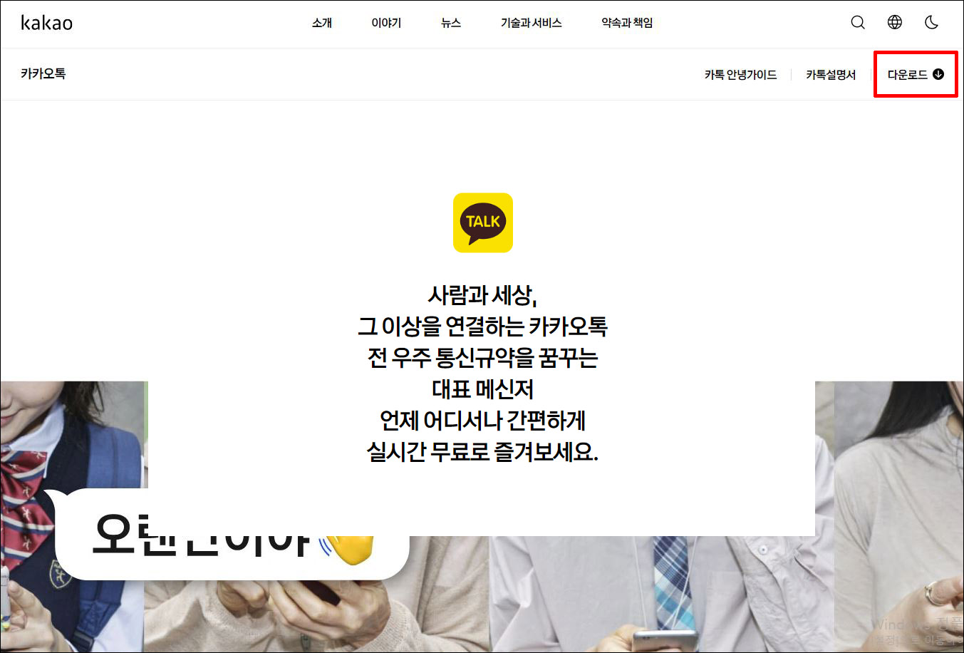 ① 카카오톡 공식 홈페이지 방문 → 페이지 우측 <다운로드>를 클릭합니다.