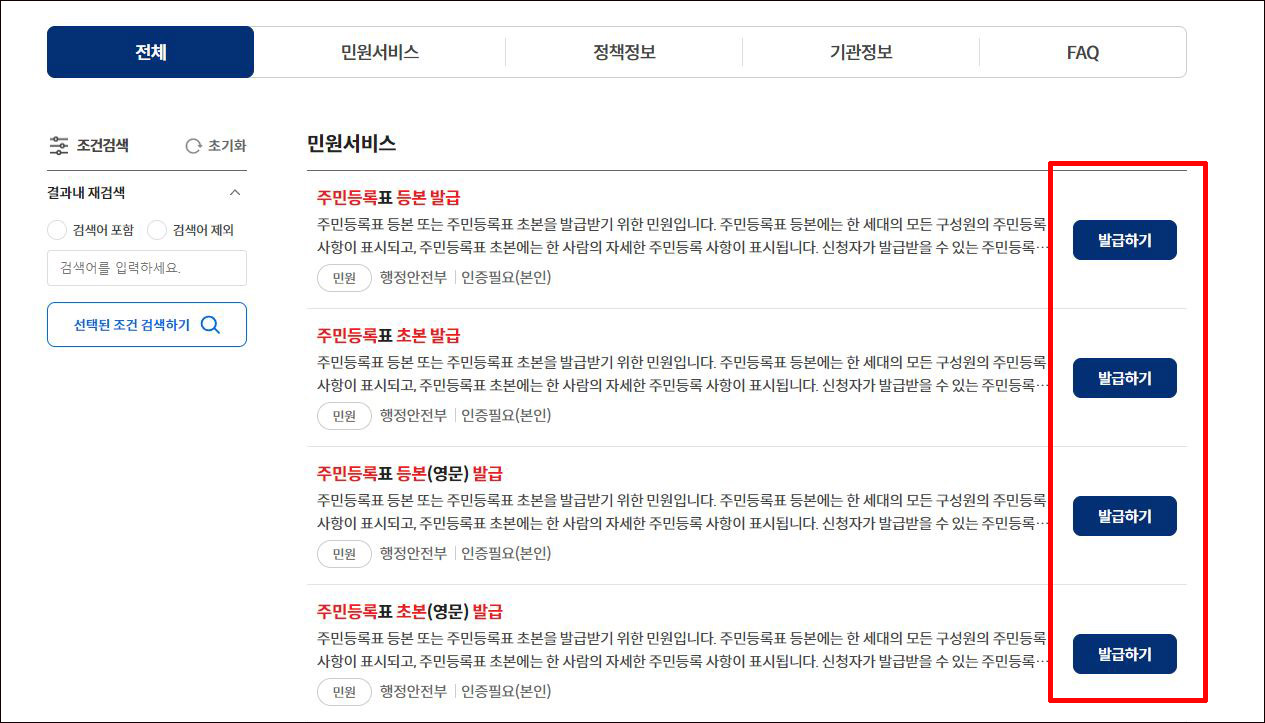 ② 검색 화면에서 우측의 필요한 주민등록표 선택 → 발급하기