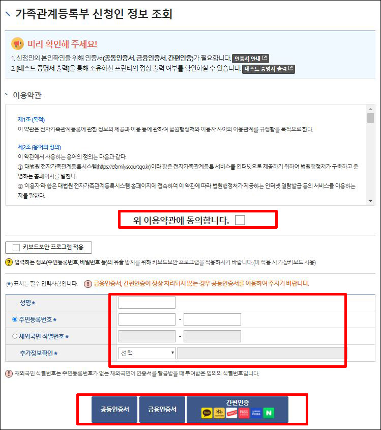 ④ 이용 약관 동의 → 개인 정보 기입 → 인증서 선택 및 로그인