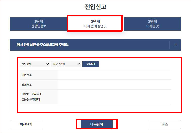 ④ 2단계 <이사 전에 살던 곳>의 주소를 조회 및 선택 → 다음단계