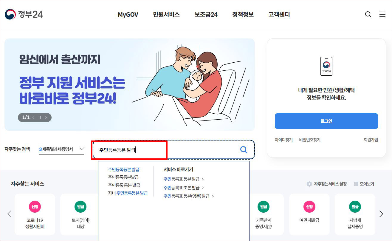 ① 정부24 홈페이지 접속 → 홈페이지 중간 "주민등록등본 발급" 검색
