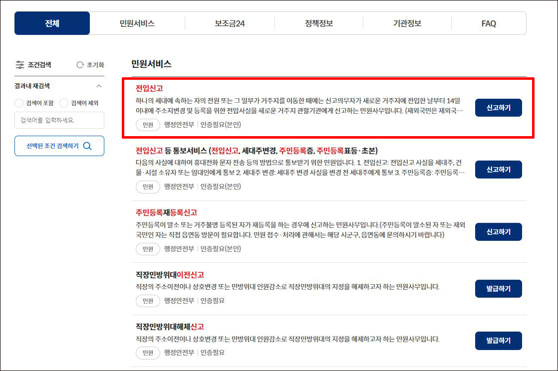 ① 정부24 홈페이지 "전입신고" 검색 → 신고하기 클릭