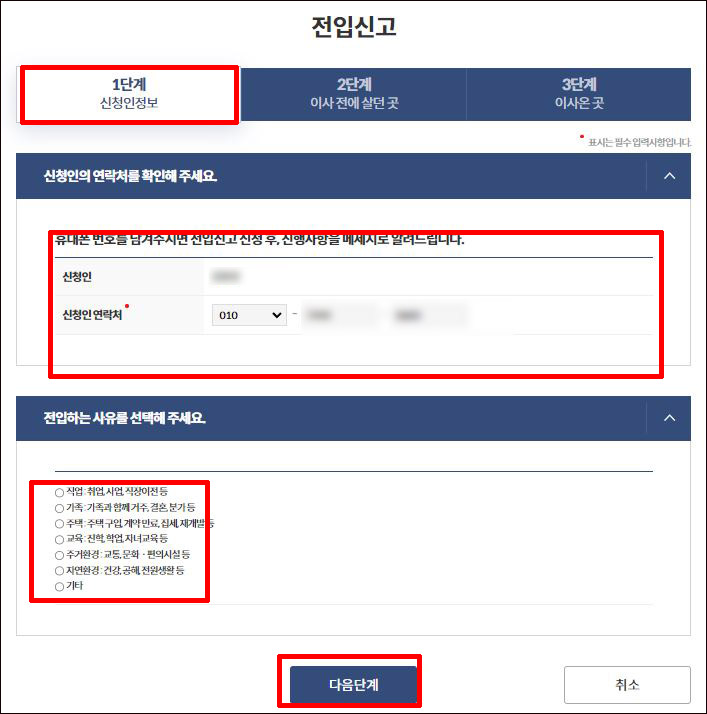 ③ 전입신고 1단계 <신청인정보> 작성 및 사유 선택