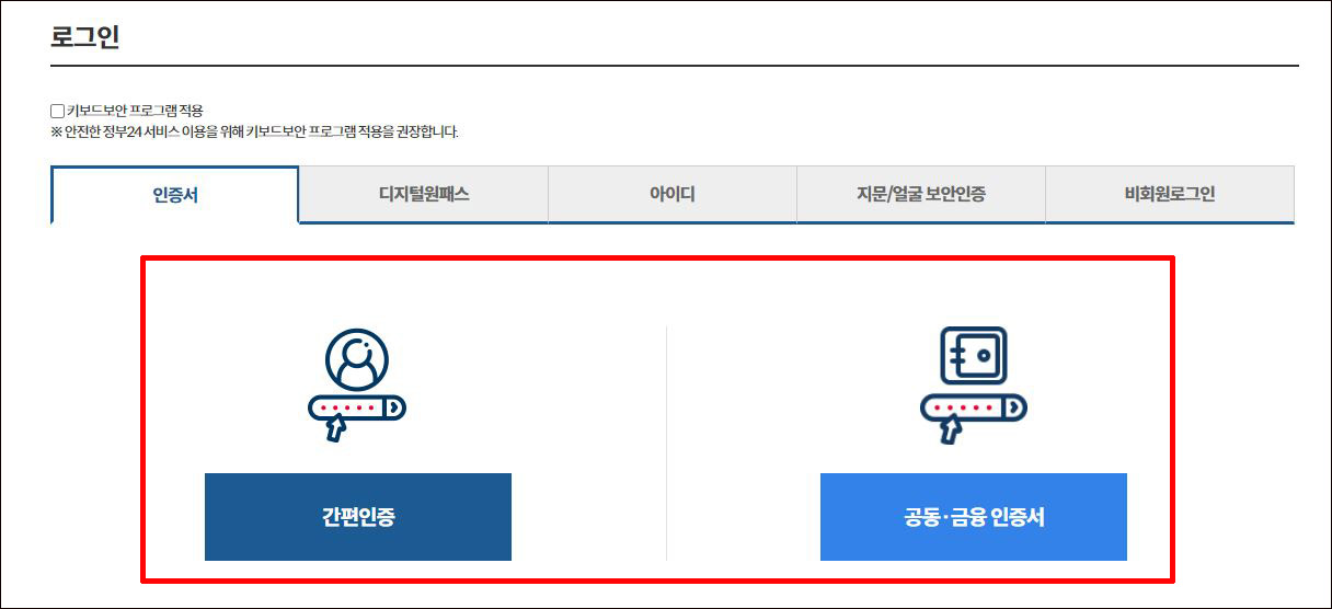 ③ 로그인 → 간편 인증 및 공동·금융인증서 선택