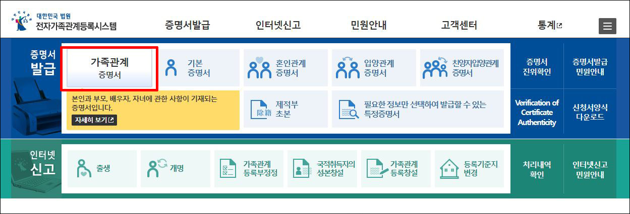 ③ 전자가족관계등록시스템 사이트 이동 → 메인 화면 → 증명서 발급 → 가족관계증명서 클릭
