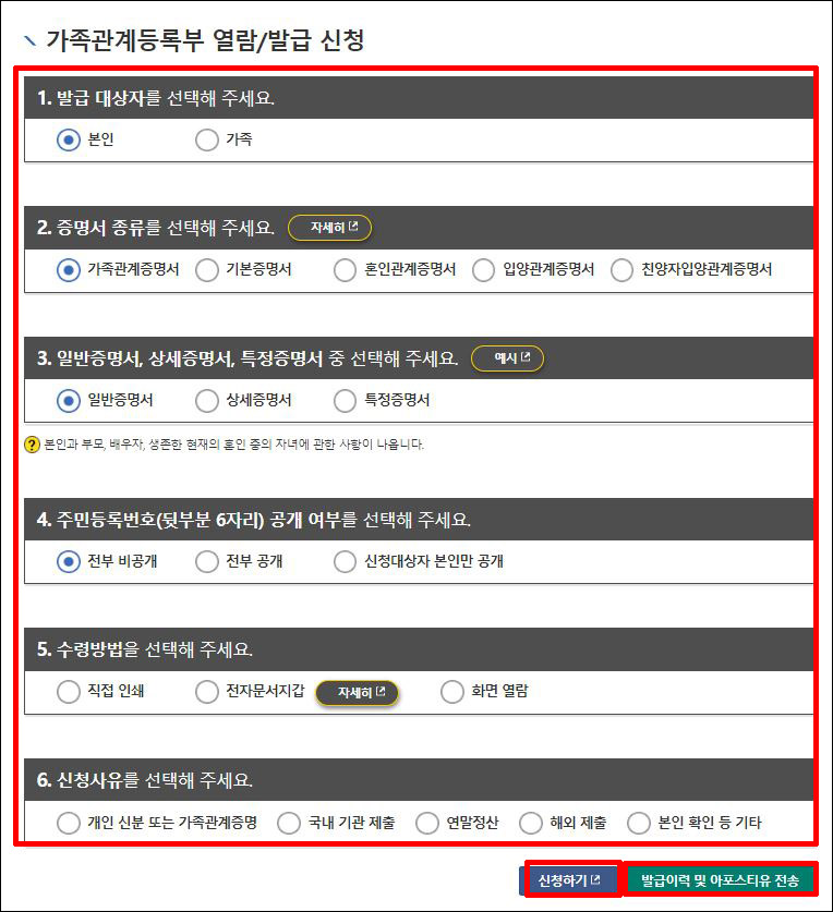 ⑤ 가족관계등록부 열람/발급 신청 → 선택사항 체크 → 하단의 <신청하기> 또는 <아포스티유 전송>