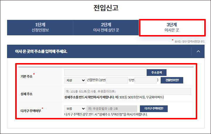 ⑤ 3단계 <이사 온 곳> → 주소 입력
