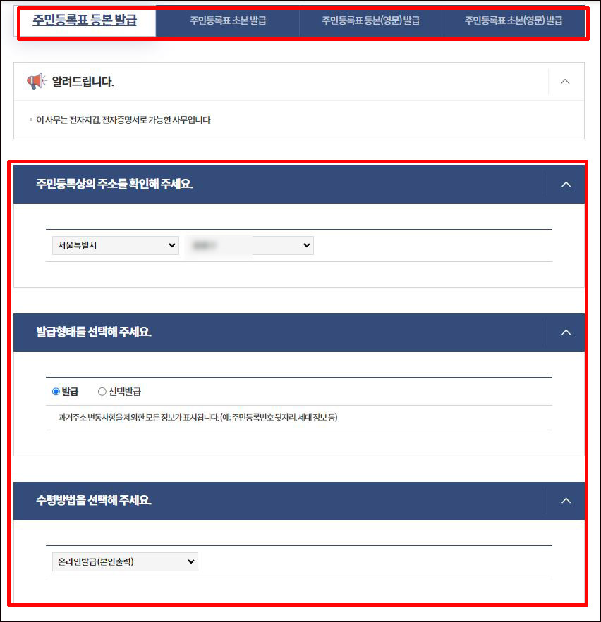 ⑤ 상단의 서비스 선택(주민등록표 등본 발급, 초본발급, 영문 발급, 초본 영문 발급)
