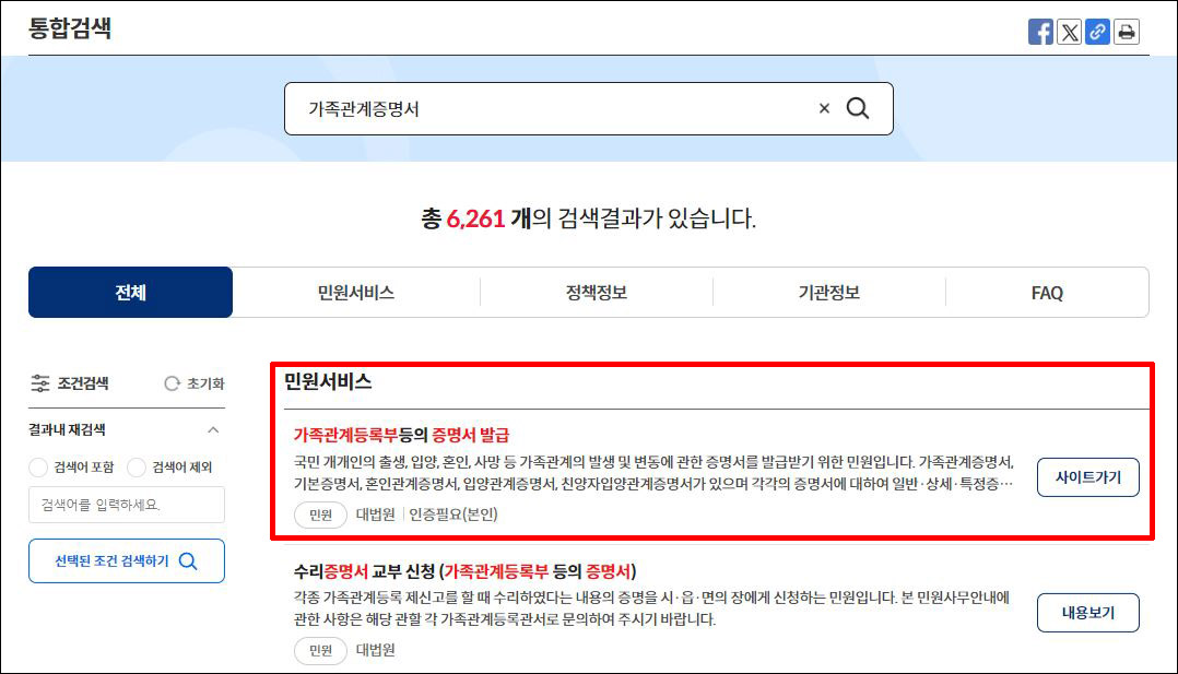 ② 민원서비스 → 가족관계등록부동의 증명서 발급 → 우측 사이트 가기