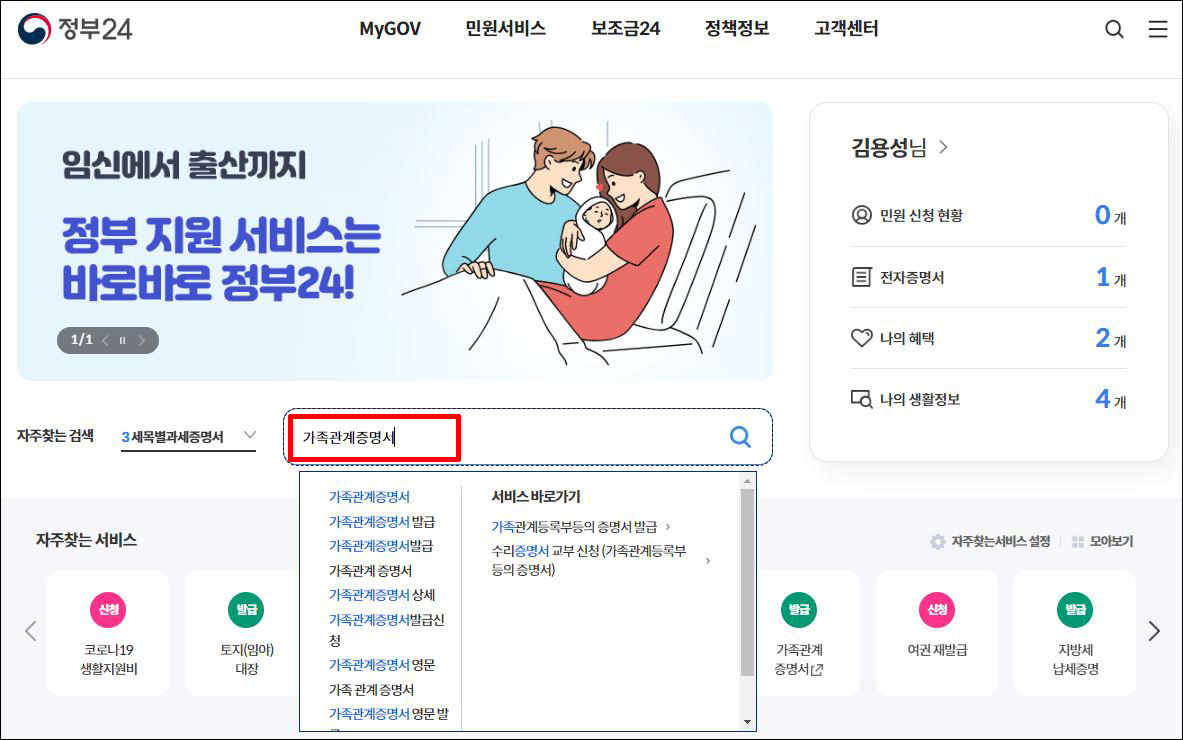 ① 정부24 메인 화면 → "가족관계증명서" 검색 이동