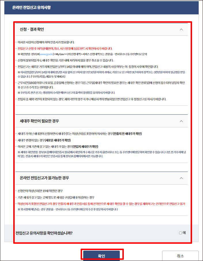 ② 온라인 전입신고 유의사항 읽어볼 것 → 하단의 "예"를 체크 → 확인