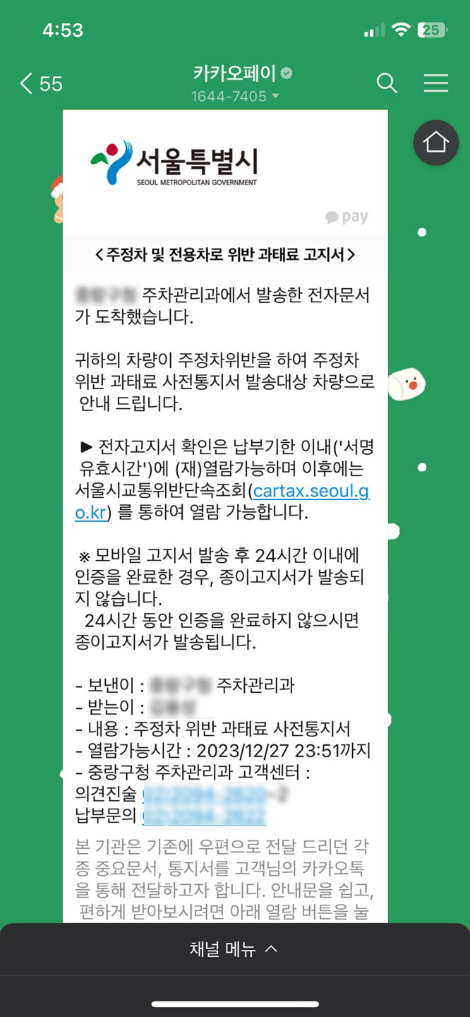 위와 같이 주정차 위반 과태료를 문자로 받을 수 있는 서비스를 통해 편리하게 조회가 가능합니다.
