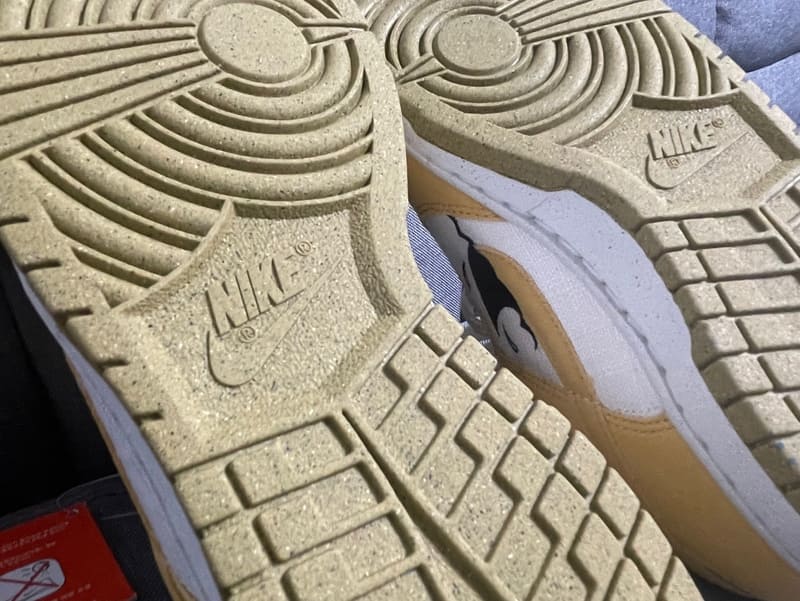 신발의 아웃솔을 살펴보면 바디에서 사용하던 옐로우보다 더욱 어두운 계열의 옐로우를 사용했는데 질감의 표현과 컬러가 마치 바닷가의 모래사장을 표현한 듯한 느낌이 듭니다. 아웃솔은 재활용을 활용한 소재로 제작되었다고 합니다.