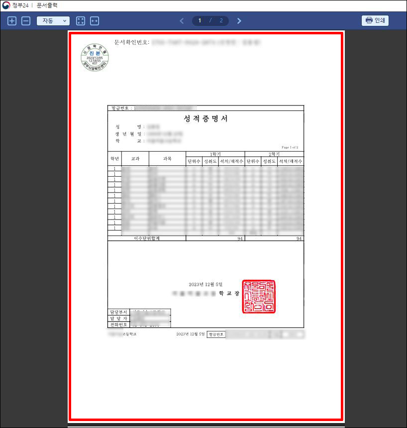 ⑧ 중·고등학교 성적증명서가 발급되고 우측의 <인쇄>를 누르시면 인쇄가 진행되고 완료됩니다.