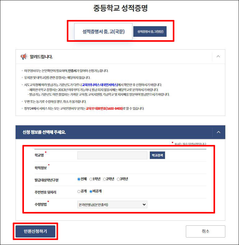 ⑤ 성적증명서 발급 페이지 이동 →  국문 또는 영문 발급 선택 →  학교명 검색 설정 → 수령방법 선택 →  민원신청하기 클릭