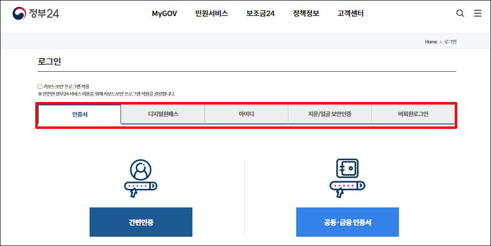 ③ 인증서 / 디지털원패스 / 아이디 / 지문, 얼굴보안인증 / 비회원 로그인 등 선택하여 로그인을 합니다.