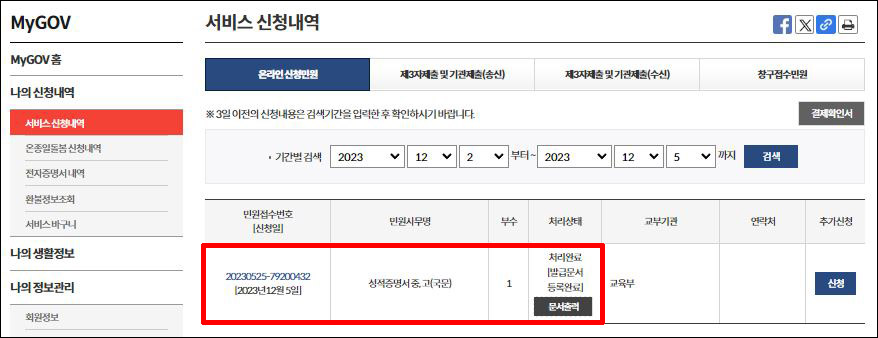 ⑦ 발급 완료 → 서비스 신청내역 페이지 → "문서출력"을 선택합니다.