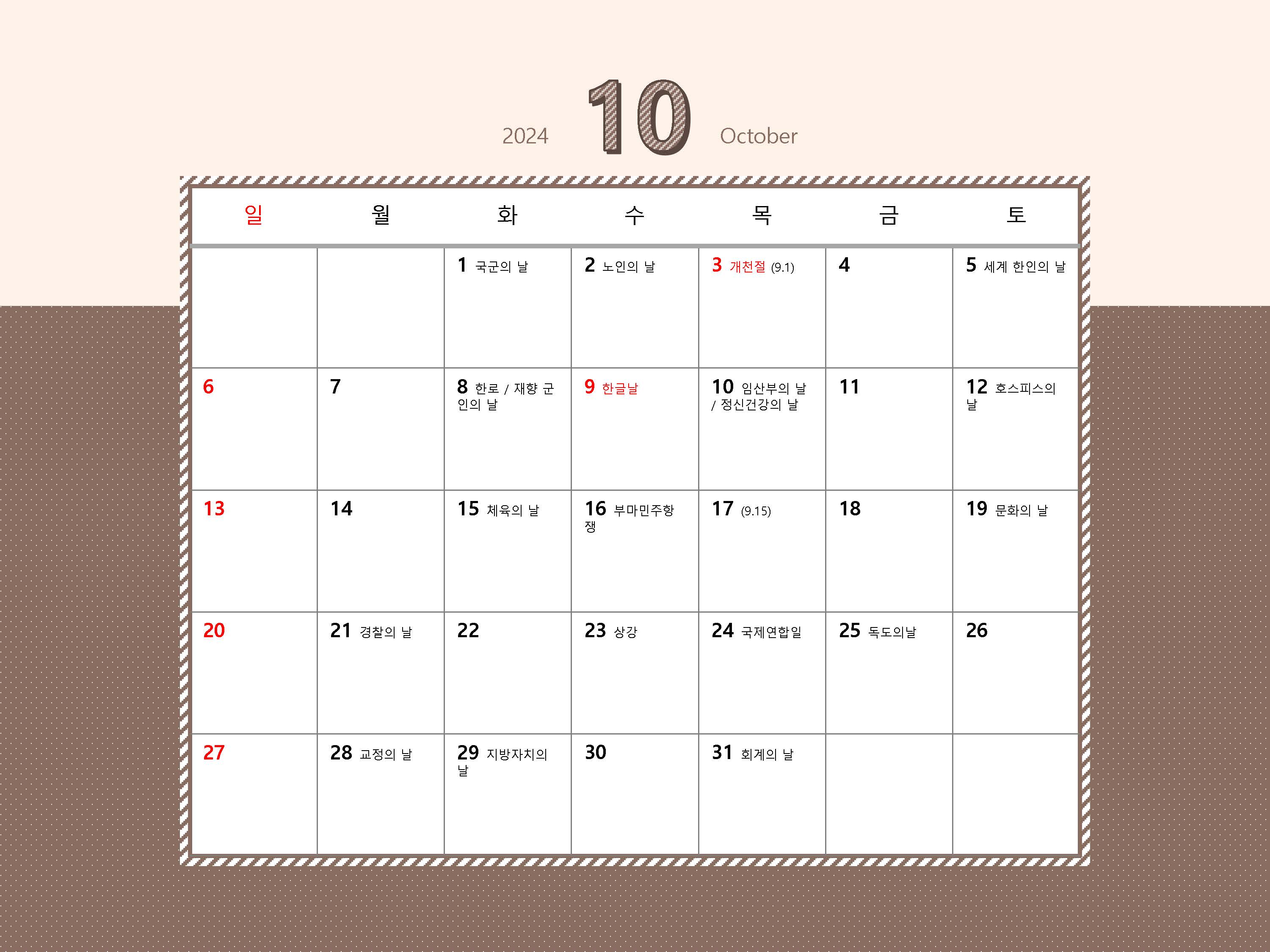 10월 공휴일 : 10월 3일(목) 개천절 / 10월 9일(수) 한글날