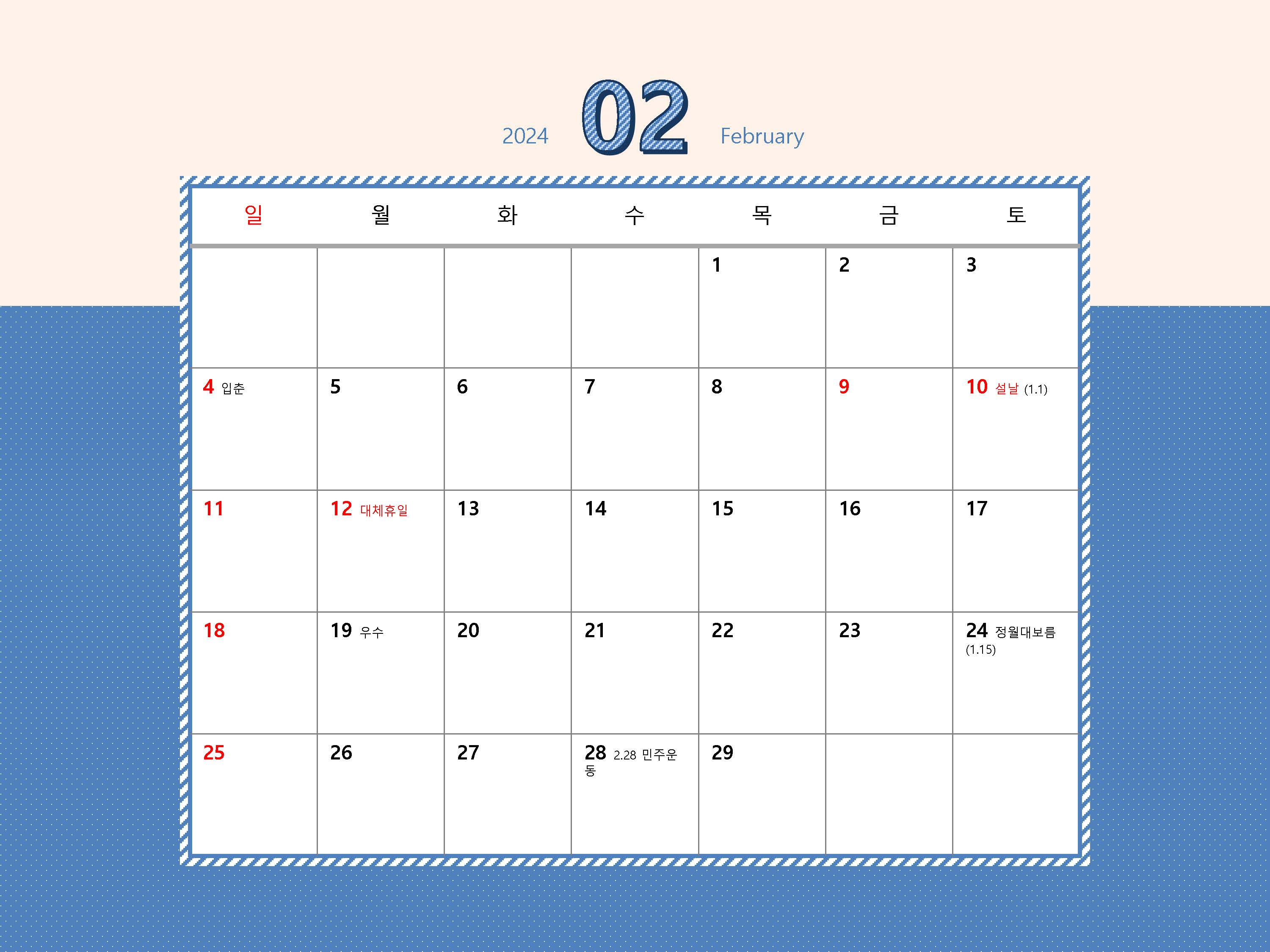 2024년 2월은 2월 9일부터 11일까지 설 연휴입니다. 주말이 끼어 12일(월)이 대체공휴일로 지정되었습니다. 총 4일의 연휴를 갖게 됩니다.