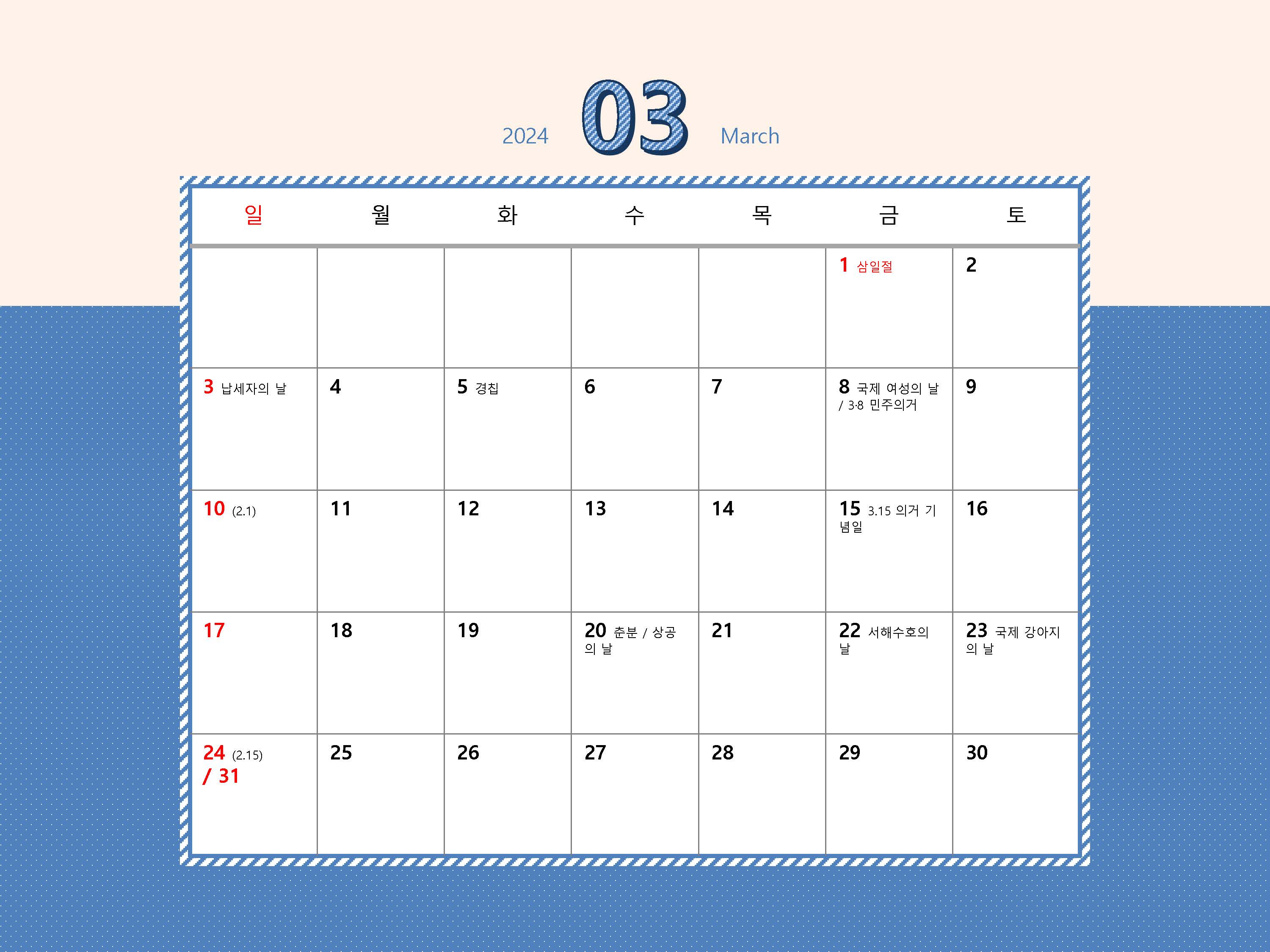 2024년 3월은 3.1절(금)요일이 공휴일입니다. 따라서 3월 1일(금)부터 3월 3일(일)까지 3일을 주말 끼고 쉴 수 있습니다.