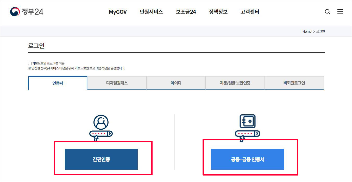 ③ 로그인 방법은 간편 인증이나 공동·금융인증서를 통해 로그인이 가능합니다.