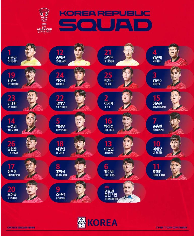 이번 아시안컵 명단을 발표하고 손흥민(토트넘)이 주장을 맡았고, 김민재(바이에른 뮌헨)가 부주장을 맡았다. 아시안컵 본선 E조인 대한민국은 1월 15일 바레인과 첫 경기를 치르고, 요르단(20일), 말레이시아(25일)와 차례대로 맞붙는다.