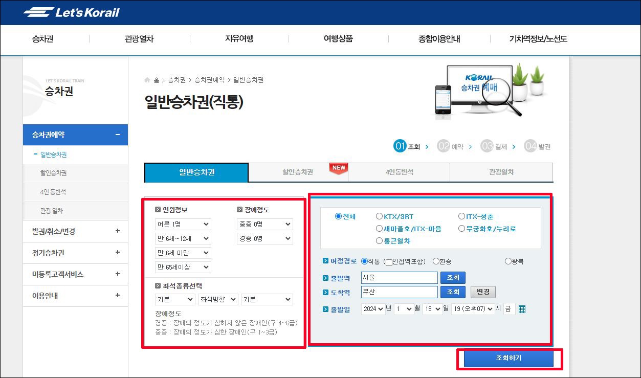 ② 승차권 선택(일반, 할인, 4인동반석, 관광열차) → 인원정보, 좌석종류, 장애정도 선택 → 출발역, 도착역, 출발일 선택