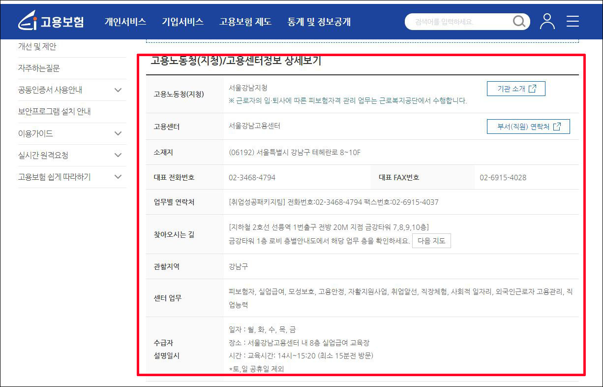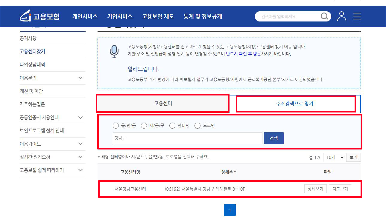 위와 같이 거주지에서 가장 가까운 고용보험센터의 검색이 간단히 확인이 가능합니다.