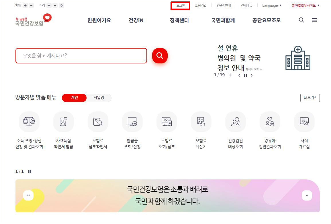① 건강보험공단 공식 웹사이트(nhis.or.kr)에서 우측의 로그인을 해줍니다.