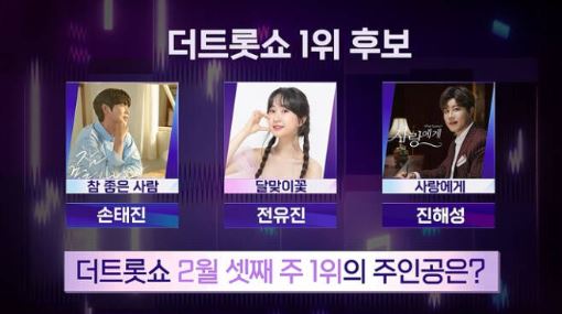 현재 손태진, 전유진, 진행성이 1위 후보에 올랐으며 1위 자리를 잡기 위해 격돌할 예정입니다. 국내 최초의 트로트 차트쇼 "더 트롯쇼"는 21년 1월 1월 이후에 발매된 곡으로만 선정되어 차트에 입성합니다.