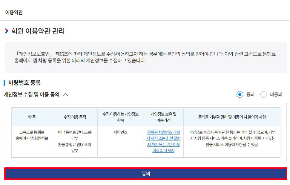 ⑧ 차량번호 입력 후 "개인정보 수집 및 동의"에 <동의>를 체크 후 하단의 <동의>를 눌러주세요