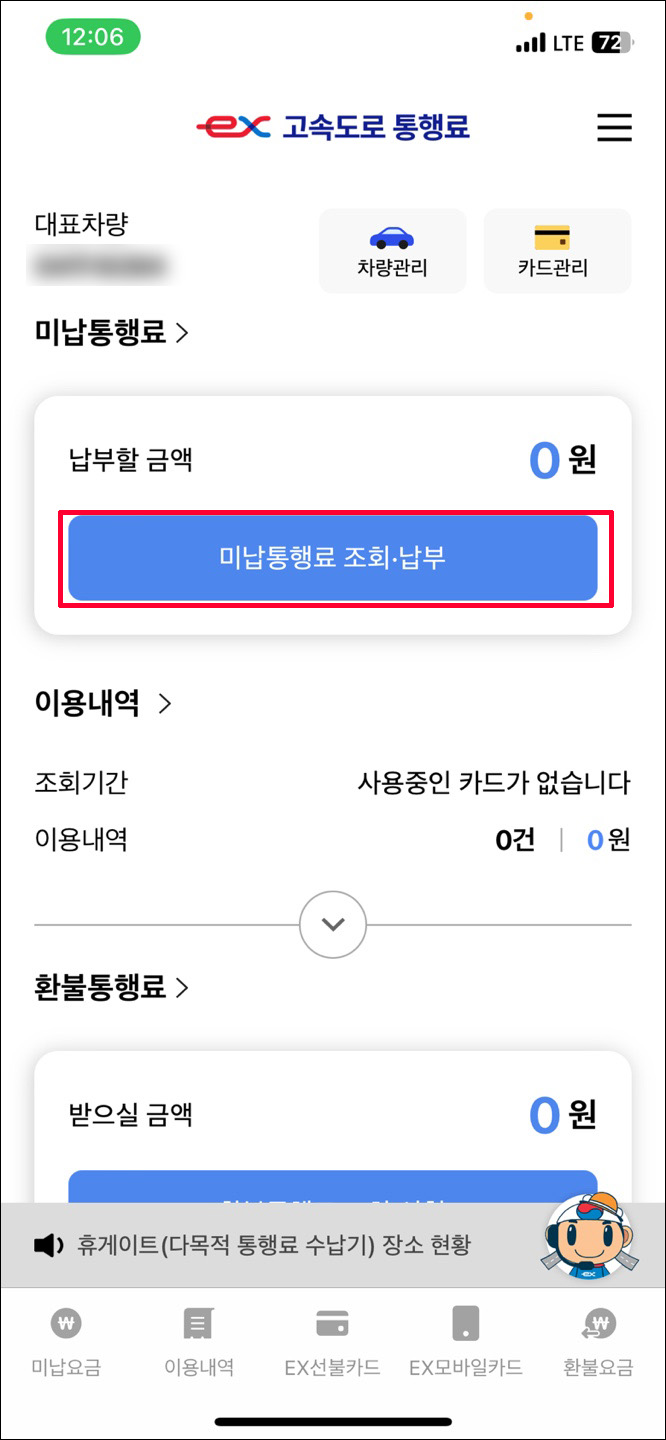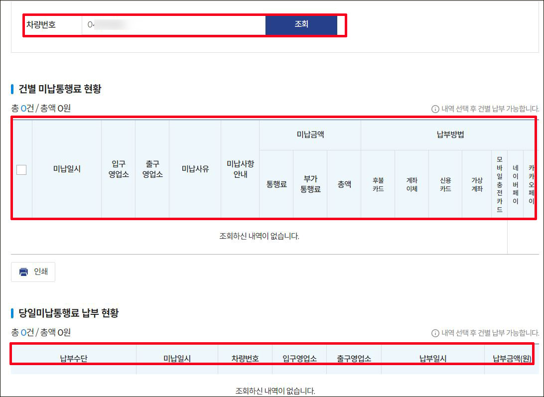 ⑨ <차량번호>를 입력 후 미납행료 조회가 가능합니다. 미납통행료가 조회되면 즉시 결제도 가능하니 이용하시길 바랍니다.
