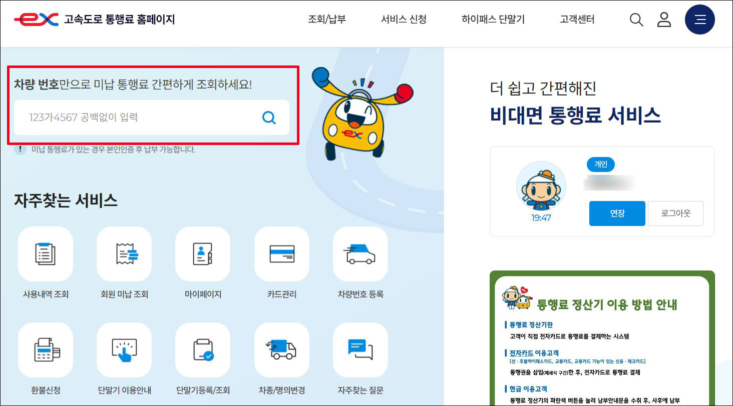 자주 이용하는 고속도로의 통행료 미납 조회나 결제 내역을 정기적으로 체크하시면 미납통행료를 방지하는데 도움이 됩니다.