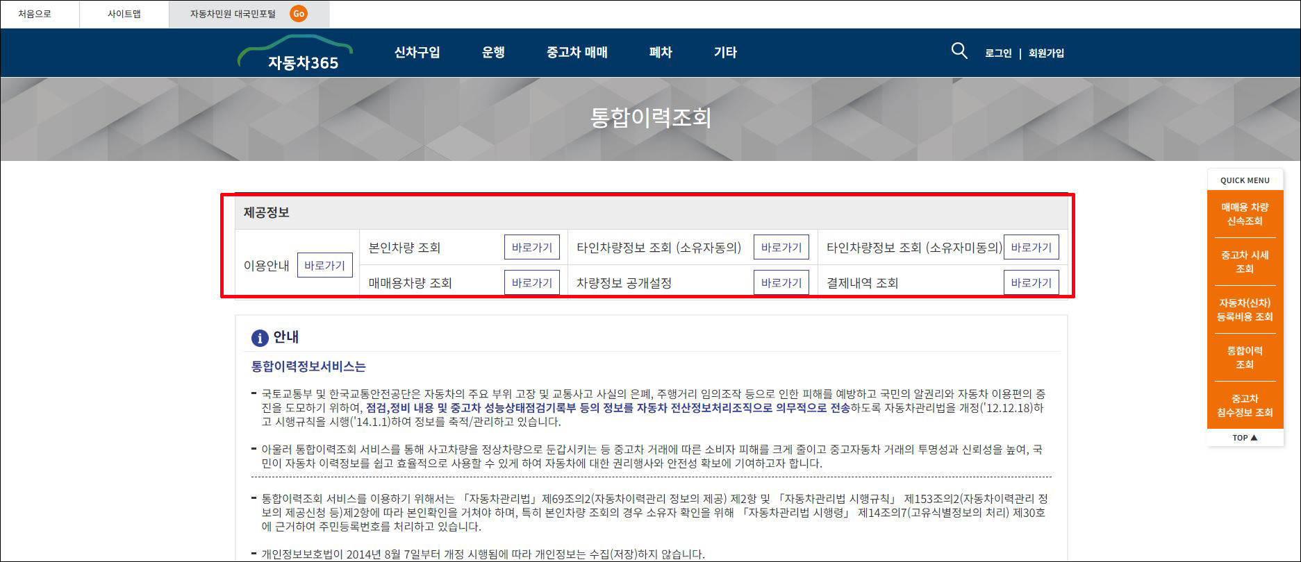 ※ 본인차량 조회 / 타인차량정보 조회 / 차량정보 공개설정 / 매매용차량 조회 / 결제내역 조회 등