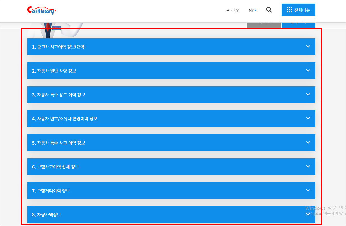 ⑧ 카히스토리에서는 중고차 사고이력 / 사양 정보 / 소유자 변경이력 / 특수 사고 이력 / 보험사고 이력 / 주행거리 이력 / 차량가액정보 등 다양한 정보를 확인할 수 있습니다.
