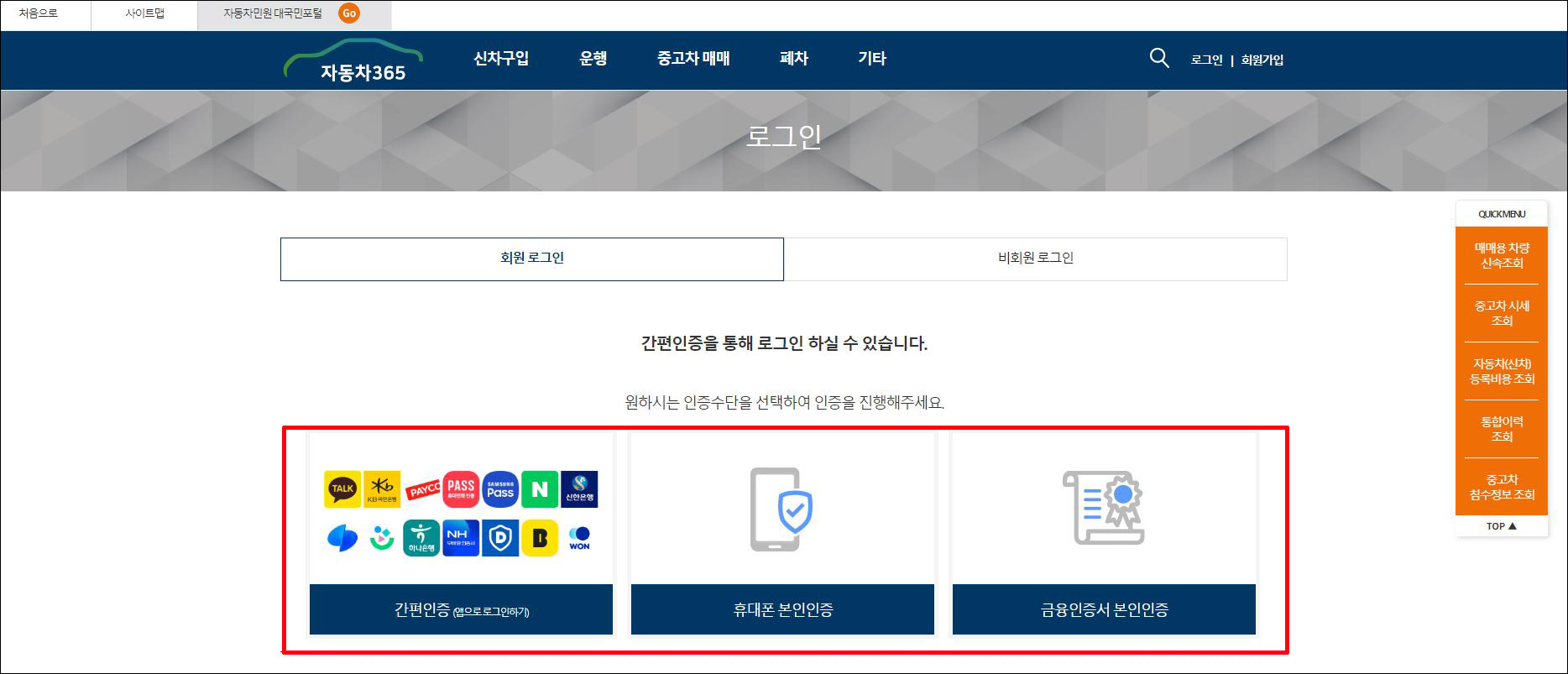 ④ 간편인증 및 비회원 로그인을 통해 로그인 후 정보를 확인하실 수 있습니다.