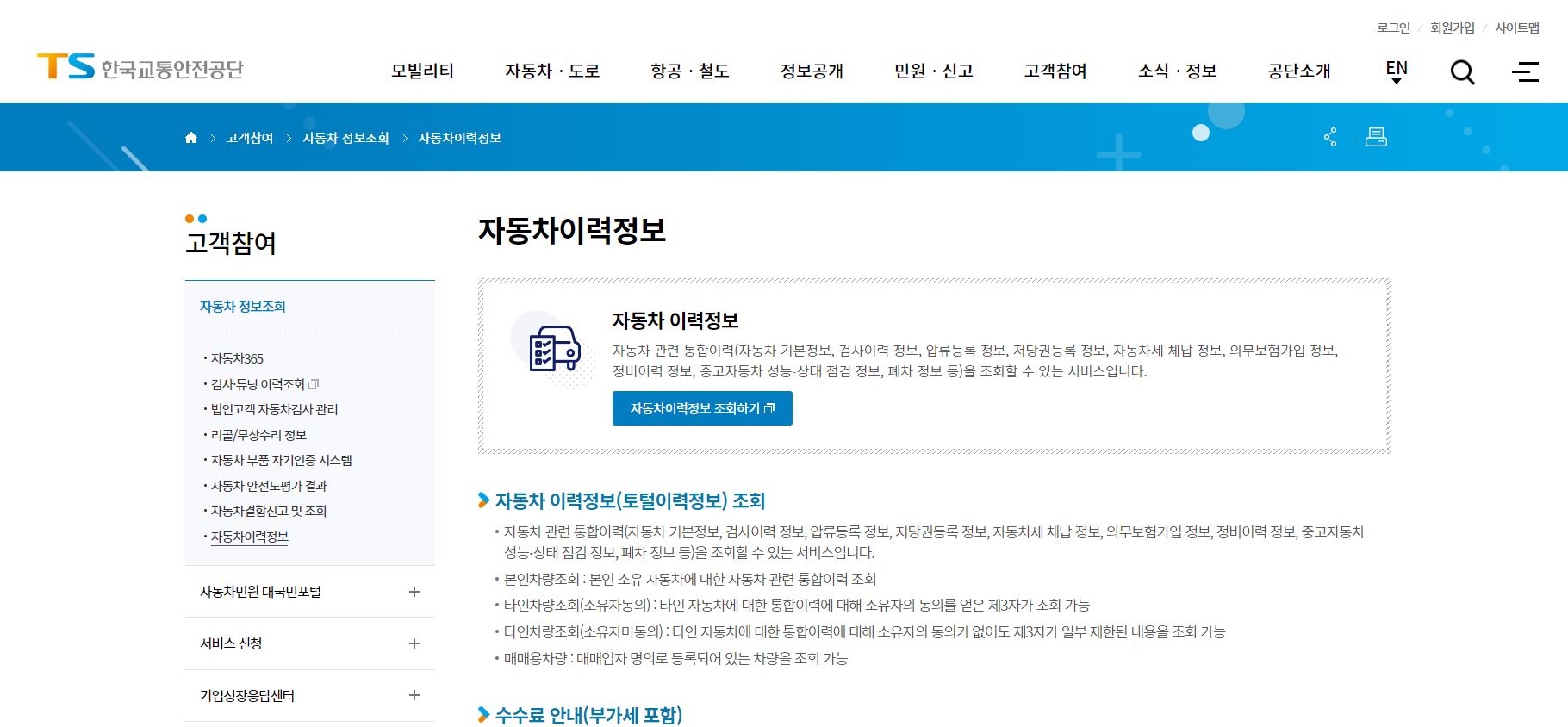TS한국교통안전공단에서 제공하는 <자동차이려정보 조회하기>를 통해서도 자동차 기본정보, 검사이력, 저당권, 체납 정보, 정비이력 등 다양한 정보를 확인할 수 있습니다.