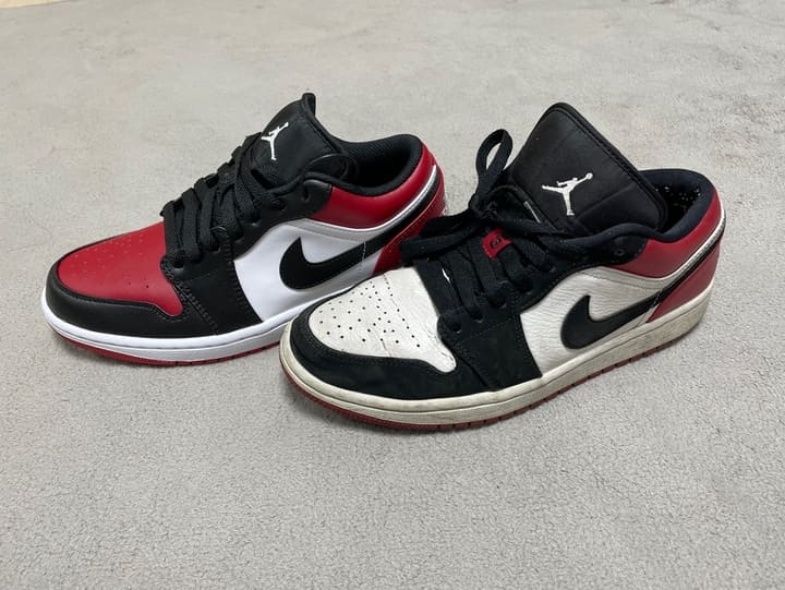 정면의 모습도 다소 어색한 감이 있는데요. 조던 1 로우를 편하게 신으실 목적이시라면 다소 가격이 저렴하므로 지금이 딱 구입하기 좋은 시기입니다. 조던1 로우의 경우 브래드 토는 10만원 중후반대 리테일가로 형성되어 있지만. 우측의 블랙토 로우의 경우는 50만원?이 훌쩍 넘어선 모델이기 때문에 비슷한 컬러의 조던1 로우 모델을 찾으신다면 브레드 토도 괜찮은 대안입니다. 이상 조던1 로우 브래드토 리뷰를 마칩니다.